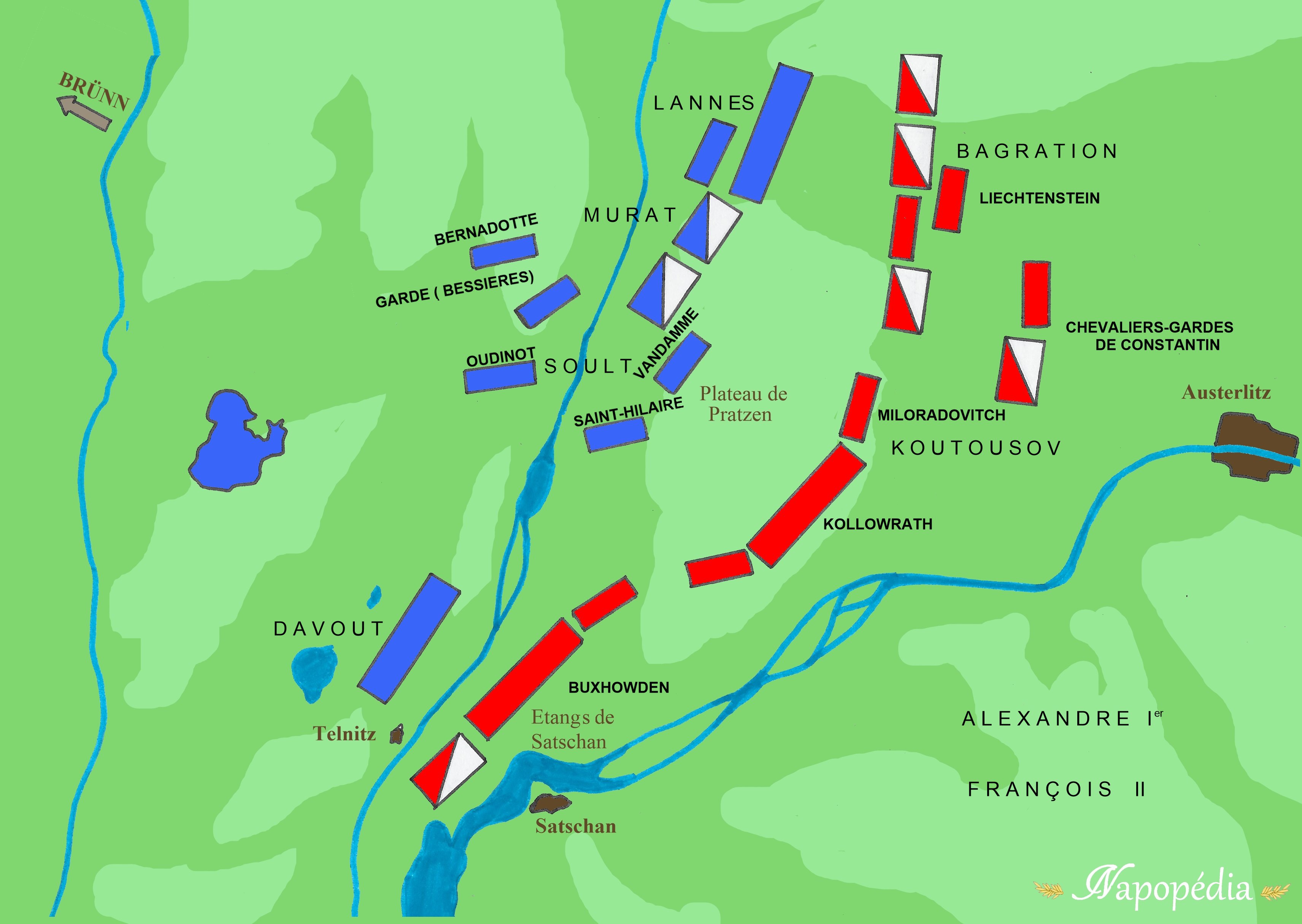 Le 2 décembre 1805, à 4 heures du matin, les 4 colonnes alliées quittent le plateau de Pratzen et marchent sur le flanc droit des Français. À 6 heures, les divisions de Soult (Vandamme et Saint-Hilaire), cachées par le brouillard, franchissent le Goldbach en silence et attendent le signal de l’attaque.